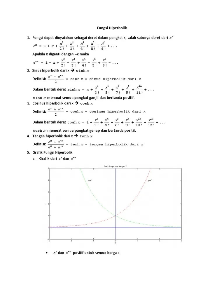 Invers fungsi hiperbolik agar memiliki invers, fungsi cosh dan sech dibatasi domainnya pada x ≥ 0. 5 10 turunan fungsi hiperbolik ppt download. Tentu c kita cari dengan rumus c²a²b² dan kita dapatkan c5. Turunan kedua dari suatu fungsi y fx adalah turunan dari turunan pertama dan diberi lambang. Fz z e x e cos y i sin y bagian real.