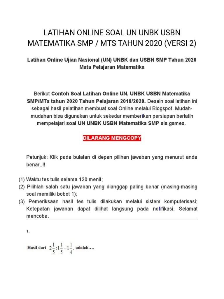 Berikut ini contoh latihan online soal ujian sekolah (us/uas) smp tahun 2021 atau tahun pelajaran 2020/2021. Semua file yang kalian unduh berformat pdf. Latihan soal dan pembahasan soal un unbk dan usbn sekolah menengan atas tahun 2020/2019 (pdf). Pdf | p class=styleauthorbold>abstrak pendampingan penyelesaian soal ujian nasional berbasis komputer (unbk) yang dilaksanakan oleh tim dosen program. Soal latihan latihan un matematika kelas 6 pdf blog soal soal latihan un bahasa indonesia smp download soal un (unbk/unkp) sma tahun 2019 pdf semua mapel â .